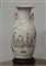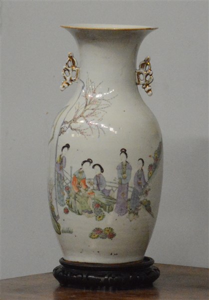 Vaso biansato in porcellana bianca con decoro a figure femminili policrome in giardino fiorito, con scritta poetica al retro, base in legno. Cina, fine dinastia Qing