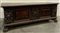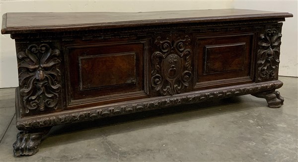 Cassone in legno intagliato con zampe ferine, fronte bipartita con formelle e mascheroni, completo di serratura. Secolo XVII (cm 164x61x55) (difetti)