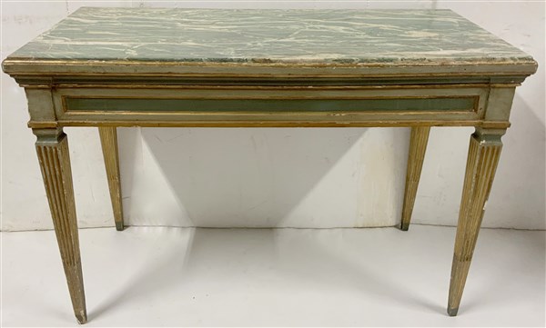 Console in legno laccato e dorato con fasce squadrate e gambe scanalate con piano in marmo (cm 122x82x60) (difetti)