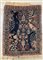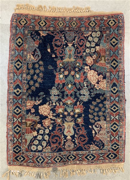 Tappeto Sarouk, Persia, Secolo XX. Decoro con due vasi fioriti contrapposti su fondo blu. (cm 80x60) (Difetti e macchie sulla frangia e vecchi restauri)