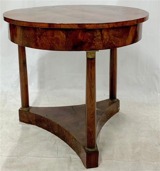 Tavolo tondo lastronato in noce retto da tre colonne riunite da crociera, guarnizioni in bronzo. Prima metà del secolo XIX (d cm 88, h cm 79) (difetti)
