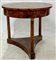 Tavolo tondo lastronato in noce retto da tre colonne riunite da crociera, guarn