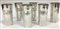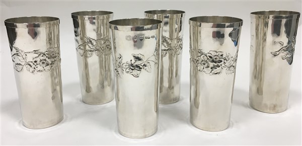 Gruppo di sei bicchieri in argento sterling con fasce sbalzate a rami di rose.