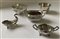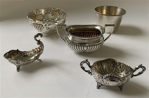 Lotto composto da un secchiello con interno in vermeille, un cestino traforato e sbalzato a tralci d'uva, due saliere e una zuccheriera biansata a corpo baccellato con punzoni di Birmingham. In metallo argentato e argento titoli 800 e 900 (g 690)