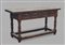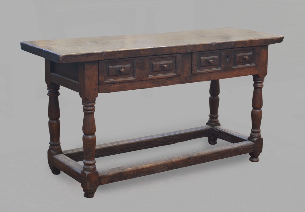 Tavolo da muro in noce a due cassetti nella fascia con gambe tornite riunite da traverse dritte, secolo XVII (cm 185x88x58) (difetti e restauri)