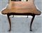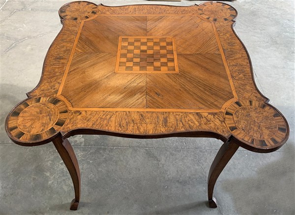 Tavolo da gioco con piano di forma mossa lastronato e filettato in legni vari, decorato al centro da scacchiera. Fascia a due cassetti poggianti su gambe sagomate. Inizio secolo XIX (cm 92x75x92) (difetti)