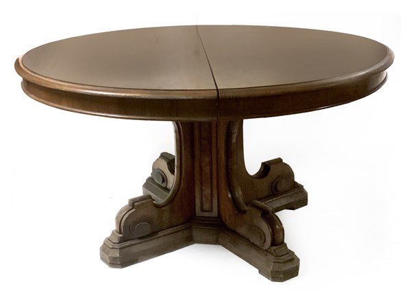 Tavolo allungabile lastronato di forma ovale poggiante su gamba centrale a colo