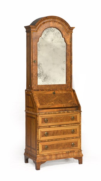 Trumoncino lastronato e radicato, parte superiore ad un anta a specchio celante vani a giorno, parte inferiore con antina ribaltabile celante due cassettini e vani, fronte a tre cassetti (cm 61x187x40) (difetti e restauri)