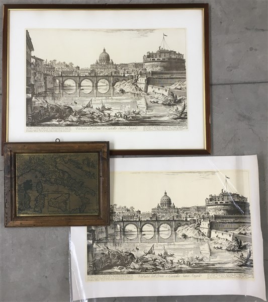 Lotto composto da dieci stampe, riproduzioni di Vedute di Roma di Piranesi (cm 40,5x55 la parte stampata), di cui nove in cornici ed una sciolta; ed una lastra incisa raffigurante la carta dell'Italia (cm 21,5x29), in cornice.