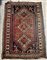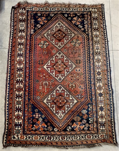 Tappeto Shiraz, Persia, inizio secolo XX. Decoro con tre medaglioni a fondo bianco su campo color mattone. (Difetti, rapature e vecchi restauri) (cm 237x157)