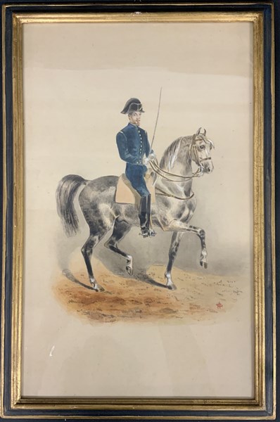 Acquerello rappresentante un istruttore di cavalleria. Siglato A.G in basso a d