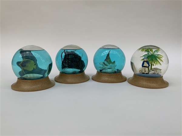 Gruppo di quattro boules de neige a tema marino. Vetro, conchiglie e materiale