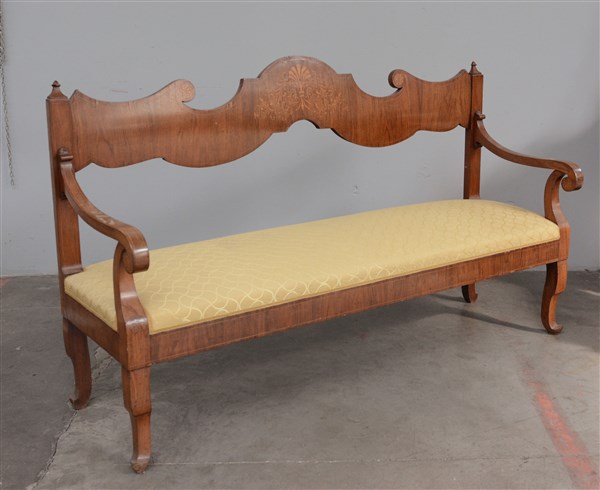 Divano "Carlo X" con schienale sagomato, filettato e intarsiato con conchigla,