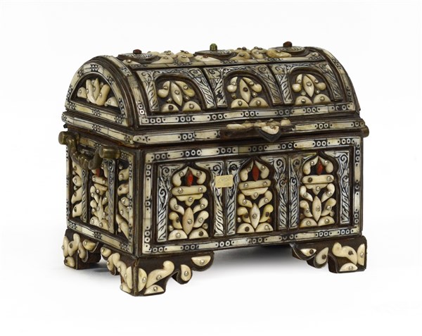 Lot 571 | Cofanetto portagioie rivestito in osso, interno in pelle Sud Est Asiatico, iniz