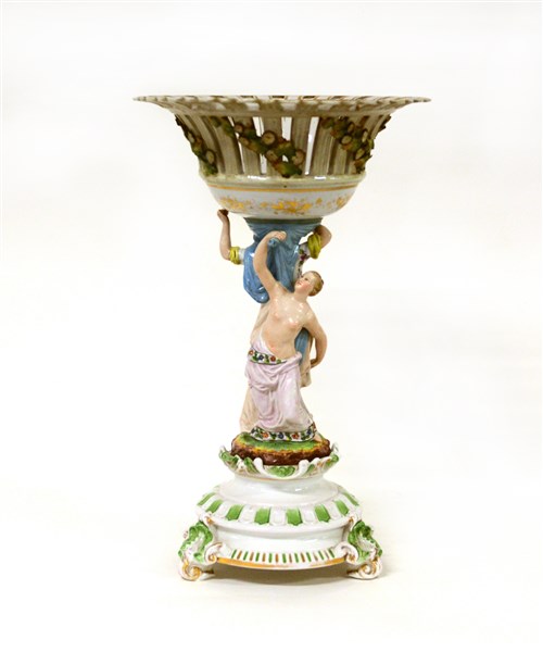 Manifattura inizio secolo XX, centrotavola in porcellana policroma con fusto decorato da due figure femminili a tutto tondo che sorreggono una coppa traforata decorata a fiori in rilievo (h cm 60) (difetti, restauri e mancanze)