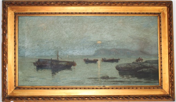 "Notturno con barche e pescatori" olio su tela (cm 45x90) Reca firma non coeva in basso a sinistra. In cornice