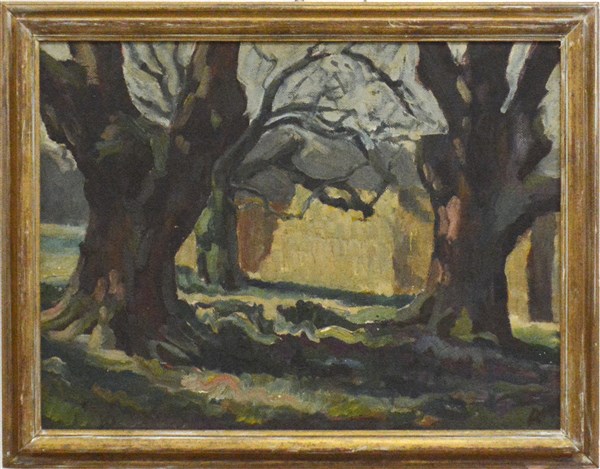 Firma indecifrata "Hatfield Park" olio su masonite cm 45x60 siglato AM in basso