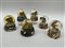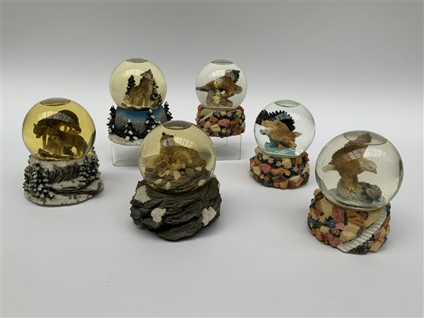 Gruppo di sei boules de neige a tema aquile e lupi di cui uno con carillon. Vetro e resina policroma (h cm 15) (lievi difetti)
