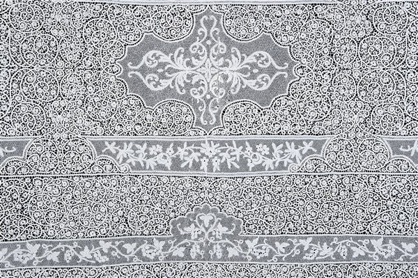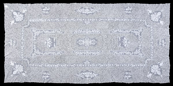 Grande tovaglia interamente lavorata con pizzo di Cantù al tombolo decorata con riserve a rete contenenti vasi fioriti e volatili. Piccolo medaglione centrale. Secolo XIX (cm 313x150)