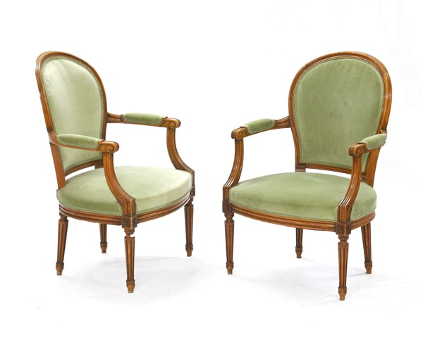 Coppia di poltrone in noce con braccioli, montanti e gambe scanalate decorate all'attacco da rosoni, rivestite in tessuto verde (difetti)
