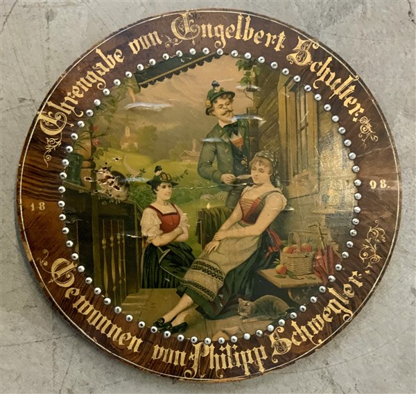 Bersaglio in legno raffigurante scena di vita con figure tirolesi, con iscrizio