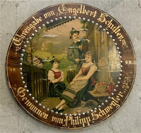 Bersaglio in legno raffigurante scena di vita con figure tirolesi, con iscrizione nella bordura (d cm 50) (difetti e restauri)