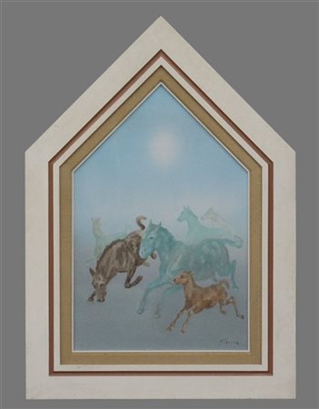 Antonio Serena "Cavalli nella prateria" olio su tela cuspidata (cm 73x48) firmato in basso a destra, etichetta al retro, in cornice