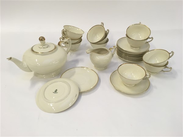 Manifattura tedesca, parte di servizio da tè in porcellana con profili dorati composto da dodici tazze con piattini, teiera e lattiera (difetti)