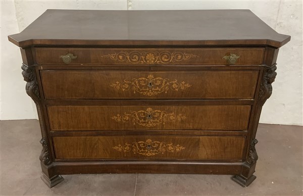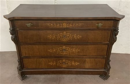 Cassettone di forma mossa, fronte a tre cassetti e mezzo intarsiati a volute e motivi vegetali. Montanti intagliati a cariatidi e motivi vegetali, secolo XIX (cm 124x93x58) (difetti)