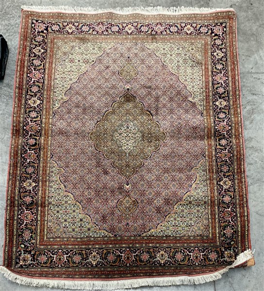 Tappeto Tabriz, Persia, Secolo XX. Decoro con medaglioni con puntali a fondo senape su campo color lavanda. Annodato in lana e seta. Motivo decorativo Herati ricorrente. (Lievi difetti) (cm 195x150)