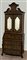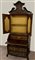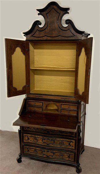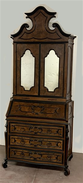 Trumeau "lombardo" in noce e radica di noce di forma leggermente mossa. Decorato con sagomette ebanizzate in rilievo. Parte inferiore a tre cassetti, anta ribaltabile con vano e cassettini interni. Parte superiore con due ante a specchio. Piedini anteriori sagomati a ricciolo (cm 109x241x49) (difetti)