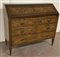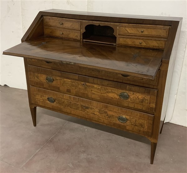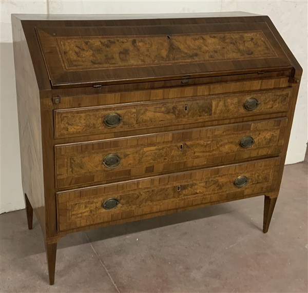 Mobile a ribalta lastronato e filettato in noce, radica e legni vari. Tre cassetti sul fronte, anta ribaltabile con vano e cassettini interni, gambe rastremate. Mobile costruito con elementi antichi (cm 118x106x49) (difetti e restauri)