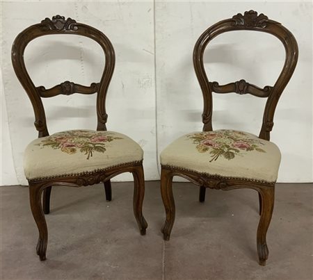 Coppia di sedie "Luigi Filippo" in noce con schienale a giorno intagliato. Sedute ricamate a motivi floreali a piccolo punto. Secolo XIX (difetti)