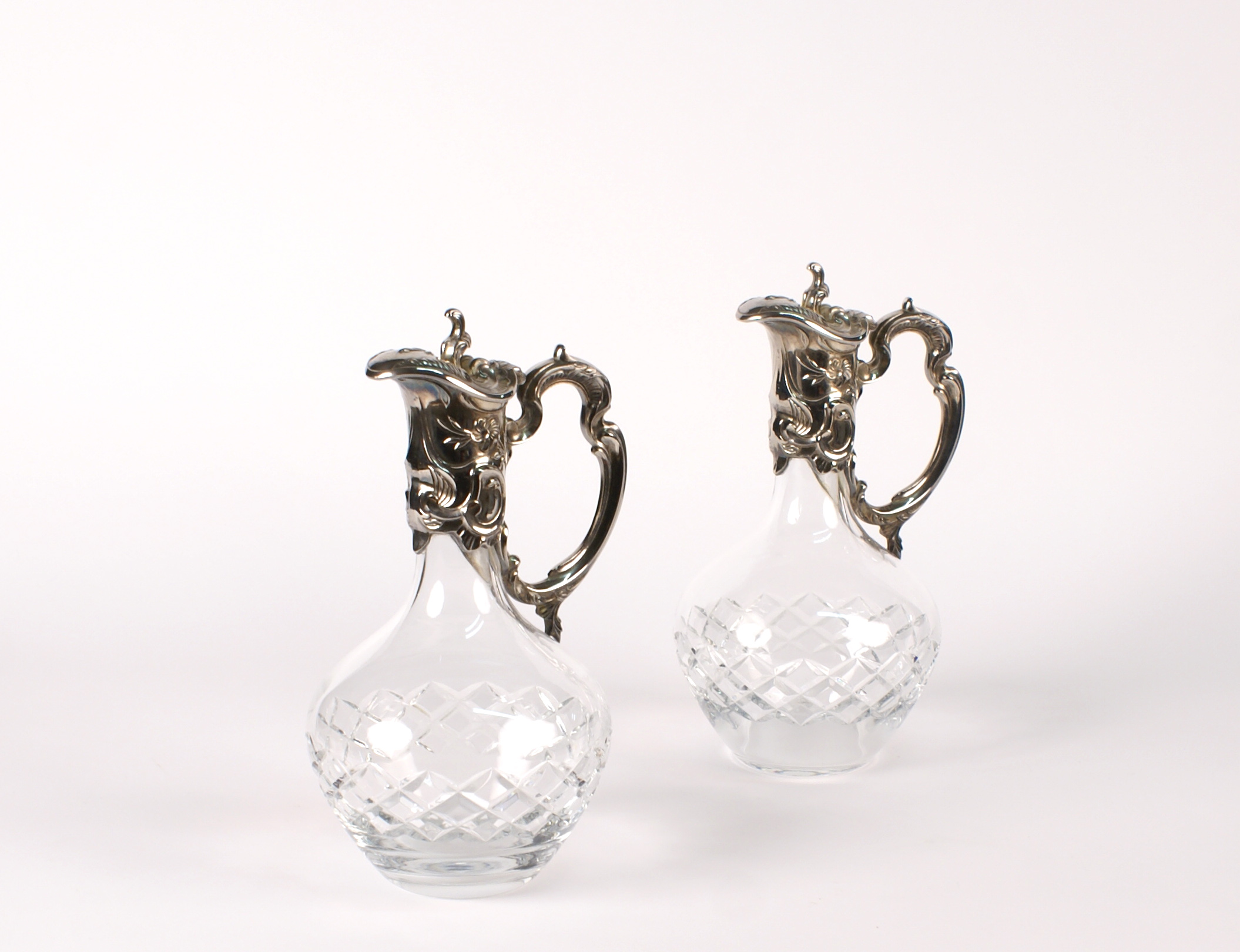 COPPIA DI CARAFFE IN CRISTALLO manici e tappi in metallo cesellato h. 27 cm.