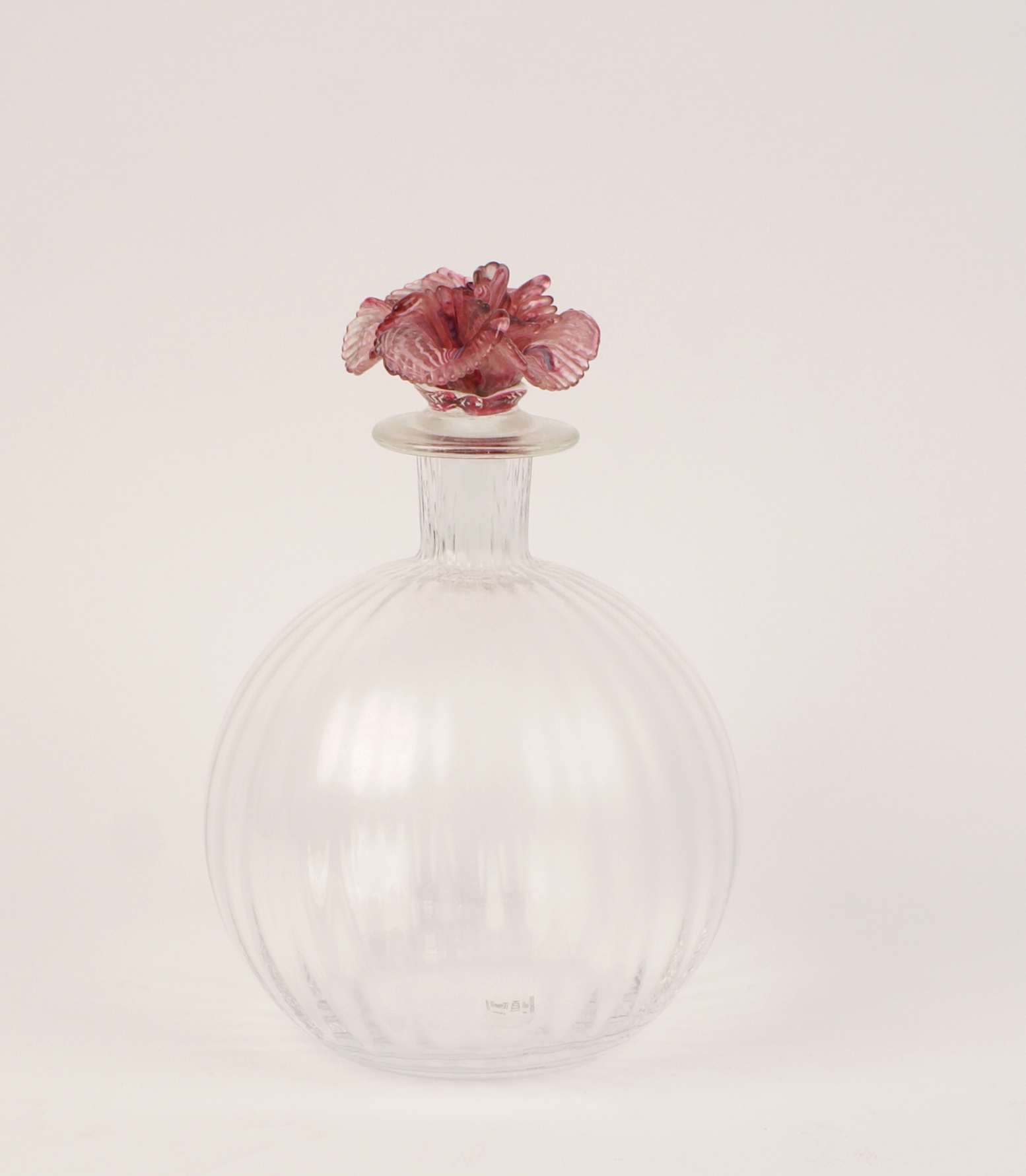 BOTTIGLIA IN VETRO TRASPARENTE manifattura di Murano con tappo in vetro policromo nella tonalità del rosa a motivo floreale h. 21 cm.