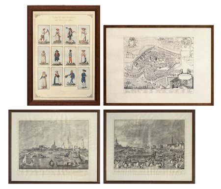 Lotto di quattro riproduzioni di soggetti e misure differenti, in cornici (dife