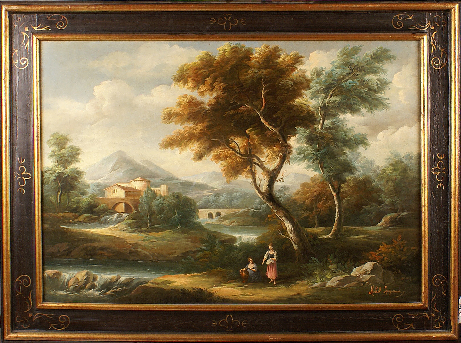 MICHEL LEGRAND XX Sec. Paesaggio fluviale con figure, olio su tela, firmato...
