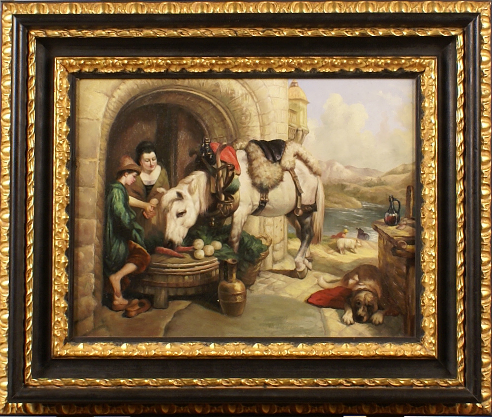 SCUOLA ITALIANA XX Sec. Paesaggio con figure ed animali, olio su tavola, entro cornice 30x40 cm.