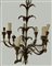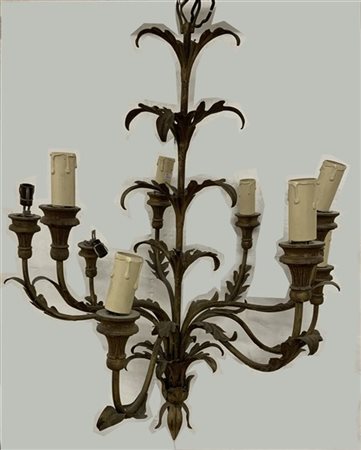 Piccolo lampadario ad otto luci in metallo dorato e legno decorato a motivi di foglie con braccia sagomate (h cm 60) (difetti e mancanze)