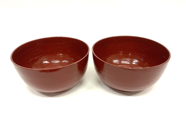 Coppia di ciotole in bamboo laccato rosso. (h cm 14; d cm 27) (lievi difetti)