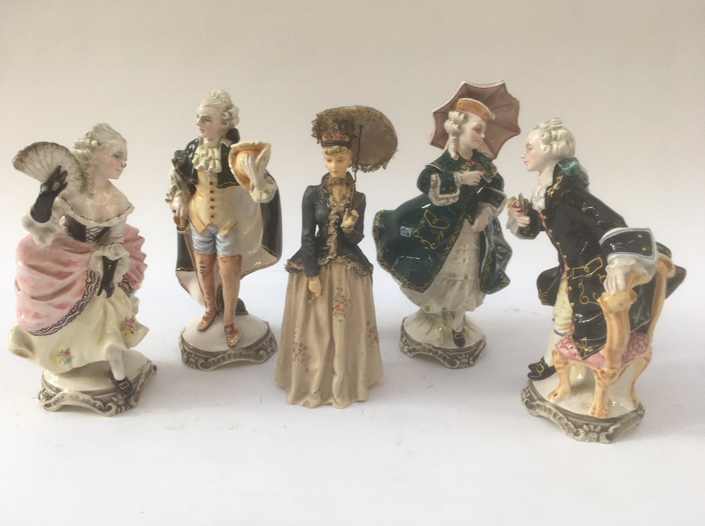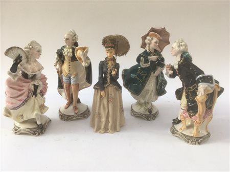 Gruppo di quattro statuine in ceramica policroma ed una in gesso dipinto raffiguranti dame e cavalieri, marcata Borsato (h max cm 22) (difetti e restauri)
