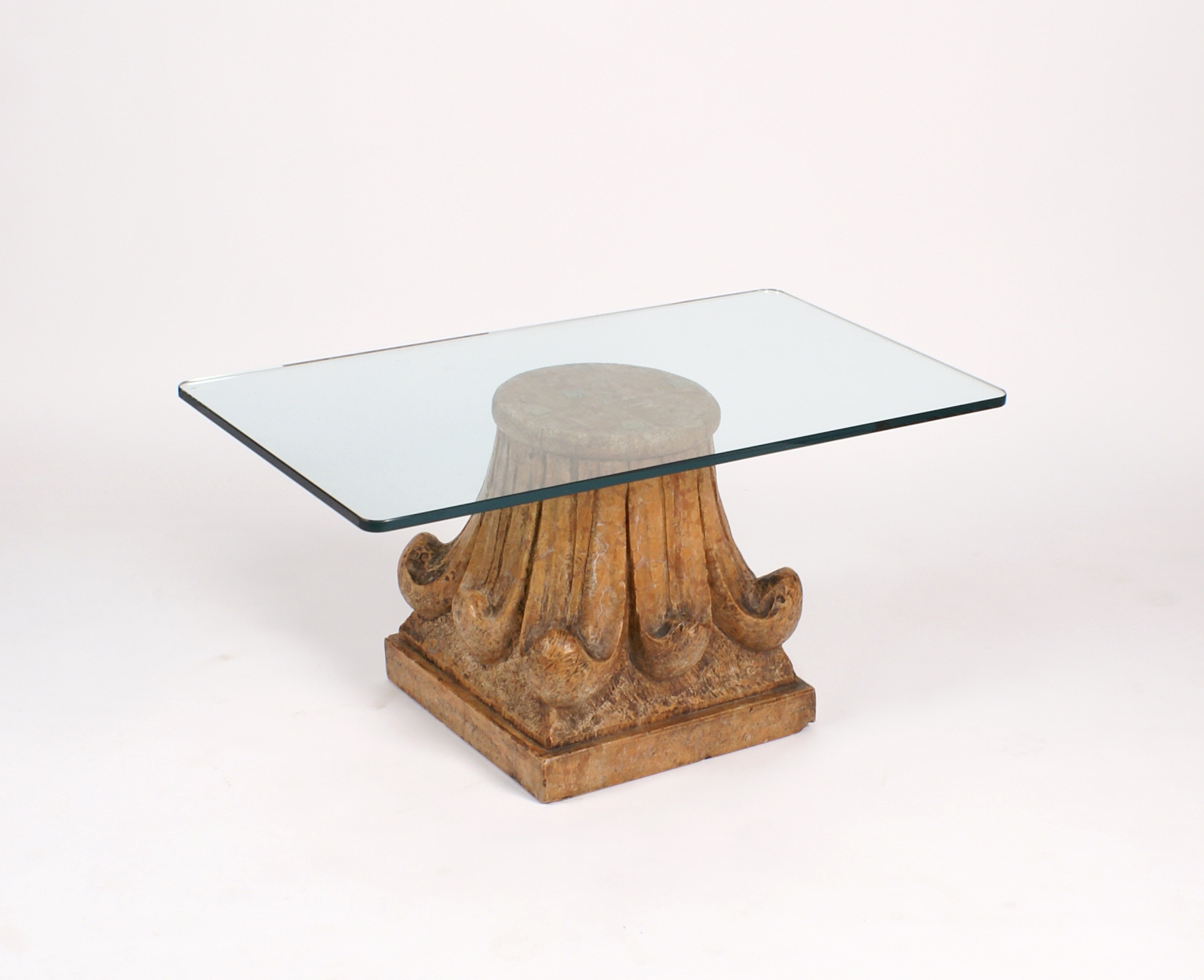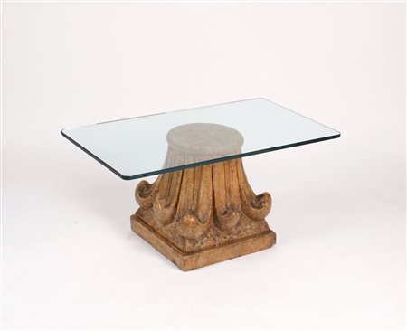 TAVOLINO BASSO vecchia manifattura piano rettangolare in cristallo molato poggiante su capitello in marmo rosso di Verona 42x89,5x50 cm.