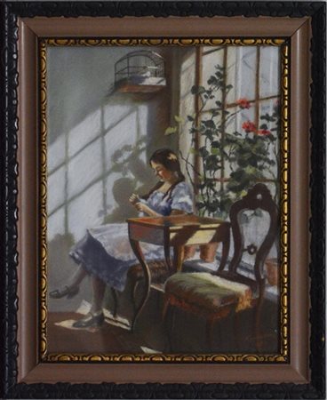 Firma indecifrata "Nella veranda" 1951, pastelli colorati (cm 40x30) Firmato e datato in basso a destra. In cornice