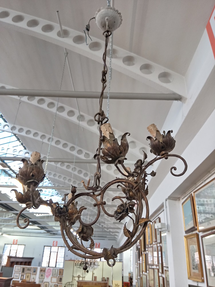 Lotto di due piccoli lampadari a uno e sei luci con struttura in ferro, foglie e fiori in lamiera dipinta (gravi difetti e mancanze)