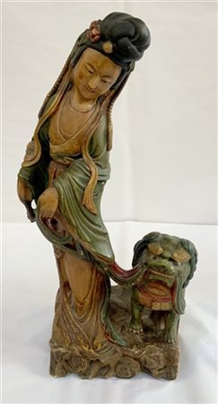Scultura in pietra dipinta in policromia raffigurante guanyin con leone buddhista. Manifattura orientale