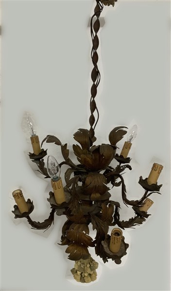 Antico lampadario ad otto luci in metallo dorato decorato a motivo di foglie a tutto tondo. Braccia in ferro ricurvi (h cm 100) (difetti)