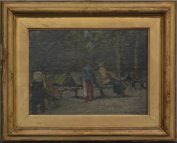 Ignoto "Al parco" olio cartone pressato (cm 23x32) Reca iscrizione P. Nomellini
