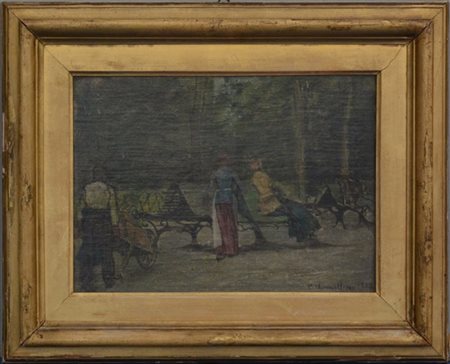 Ignoto "Al parco" olio cartone pressato (cm 23x32) Reca iscrizione P. Nomellini in basso a destra. In corncie