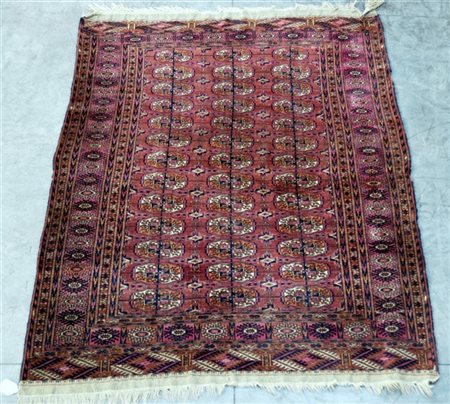 Tappeto Buhkara, Russia, secolo XX, decorato a Gul e fregi stilizzati nei toni del tabacco, amaranto, avorio e blu su fondo bordeaux (cm 197x129) (difetti e rotture)