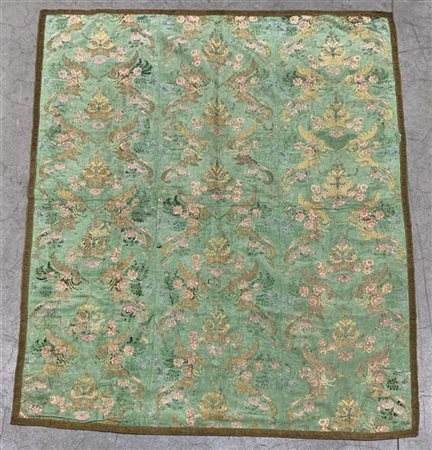 Drappo in seta jaquard broccata in argento con decori floreali su fondo verde,